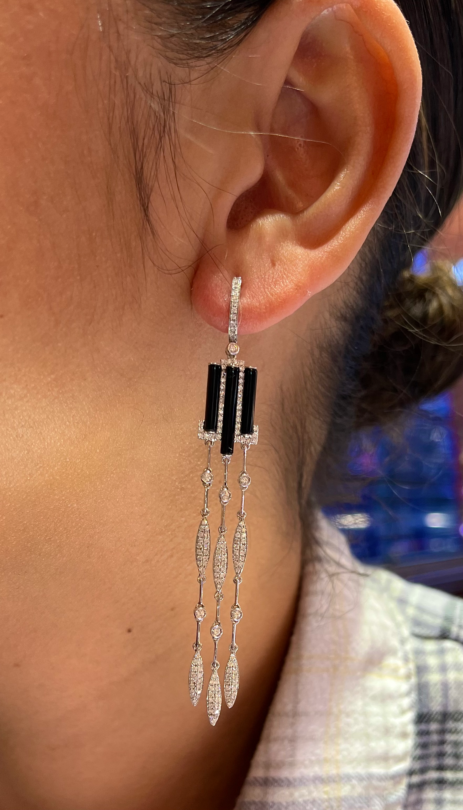 A glance: three strands of black Onyx, set with Diamonds in between. Three strands of Diamonds, set in alternating round and marquise-shaped bezels, all in 18Karat White Gold. Hanging from Diamond lever-back posts