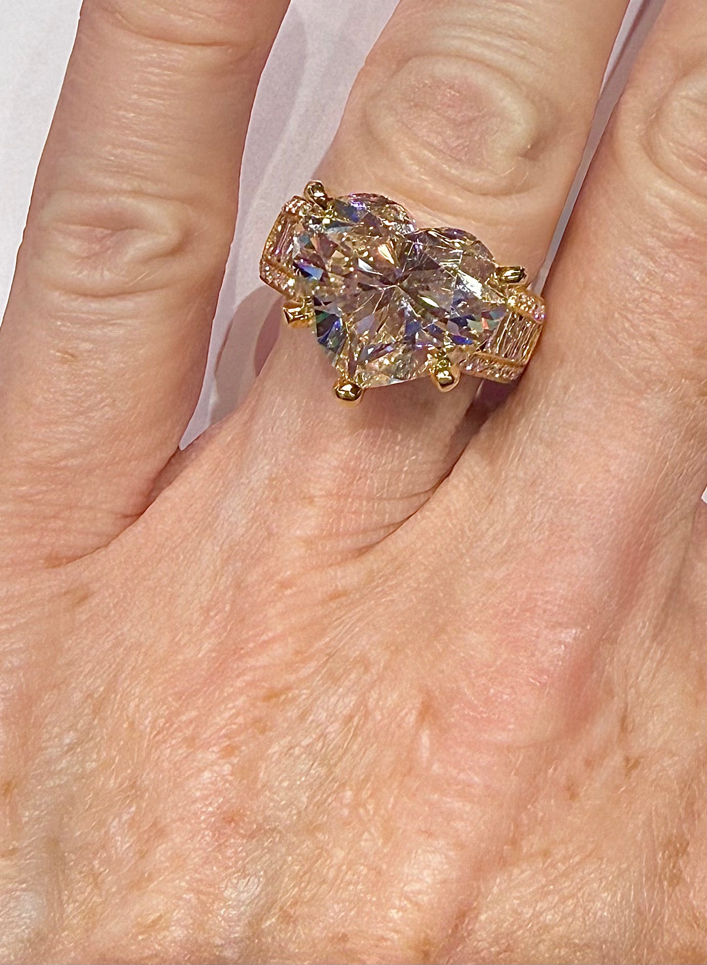 A glance: Heart shaped Diamond center, set with five gold prongs. Set beneath the center stone is a hidden halo of round Diamonds. A half eternity bridge runs beneath and flanks both sides of the center stone. This bridge is made up of alternating marquise and baguette Diamonds. One row of round Diamonds is set on either side of the bridge, and is edged with mil grain. The front and back of the ring is also set with a half eternity row of round Diamonds, also edged in mil grain. The entirety of the ring is set in 18K yellow Gold
