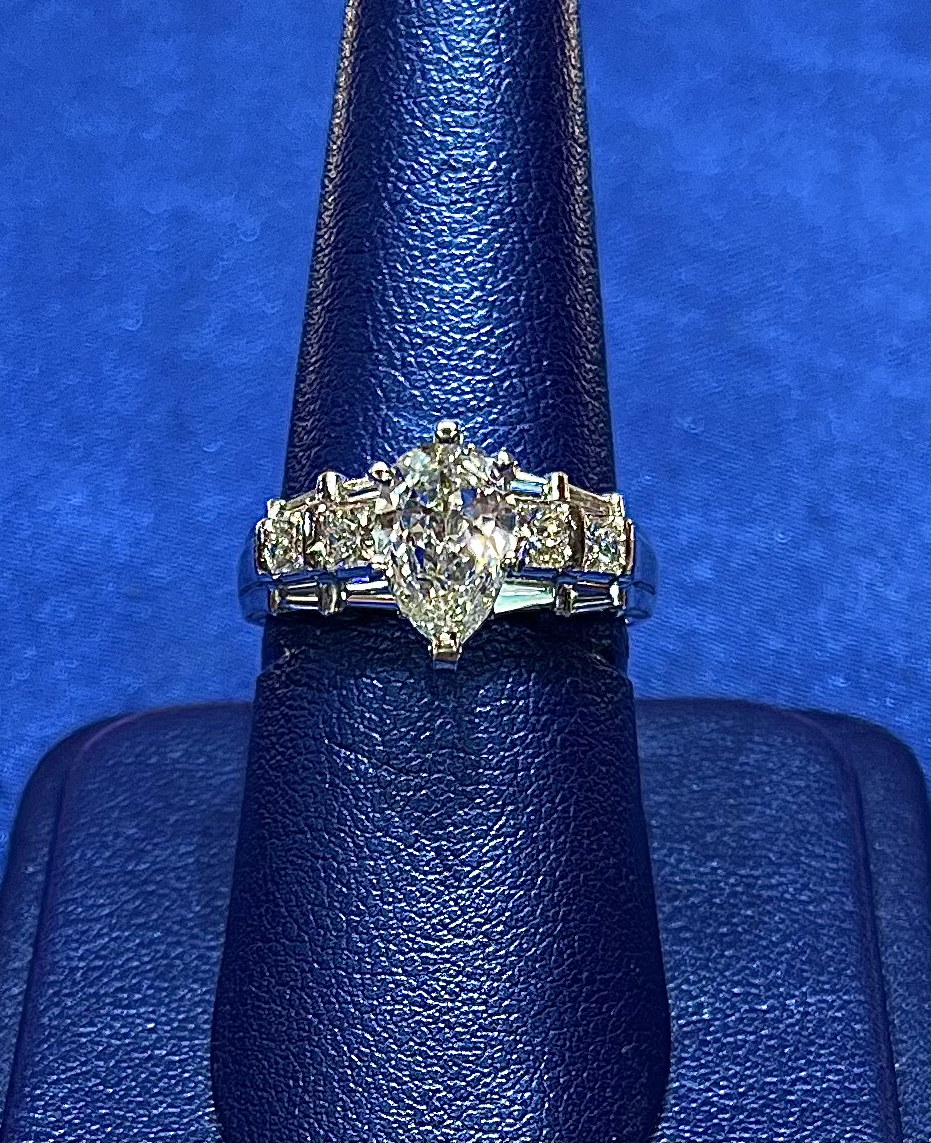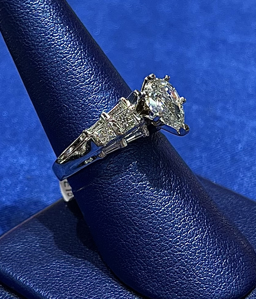 A glance: Pear cut Diamond center, set with six prongs. The center stone is flanked on either side by two each of Princess cut and Baguette Diamonds. The entirety of the ring is set in Platinum