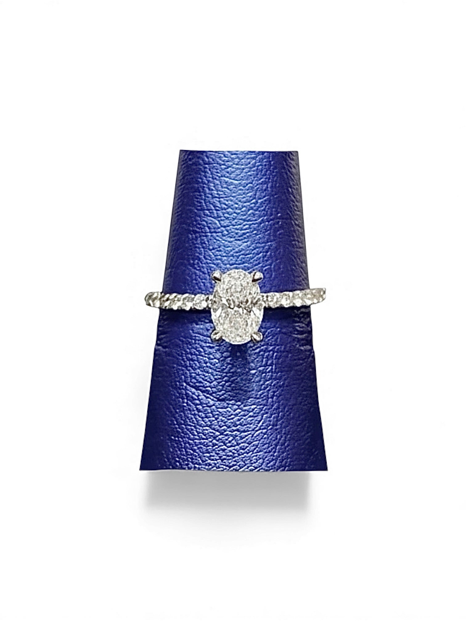 A glance: Oval cut Diamond center, set with 4 prongs. Each prong has round Diamonds going half way up. Under the center stone is a hidden halo of small round Diamonds.  Directly under the bottom point of the prongs, on either side is a slightly larger round Diamond. The center stone and Diamond prongs are mounted on a single band of round  prong set Diamonds.  All set in 18K White Gold