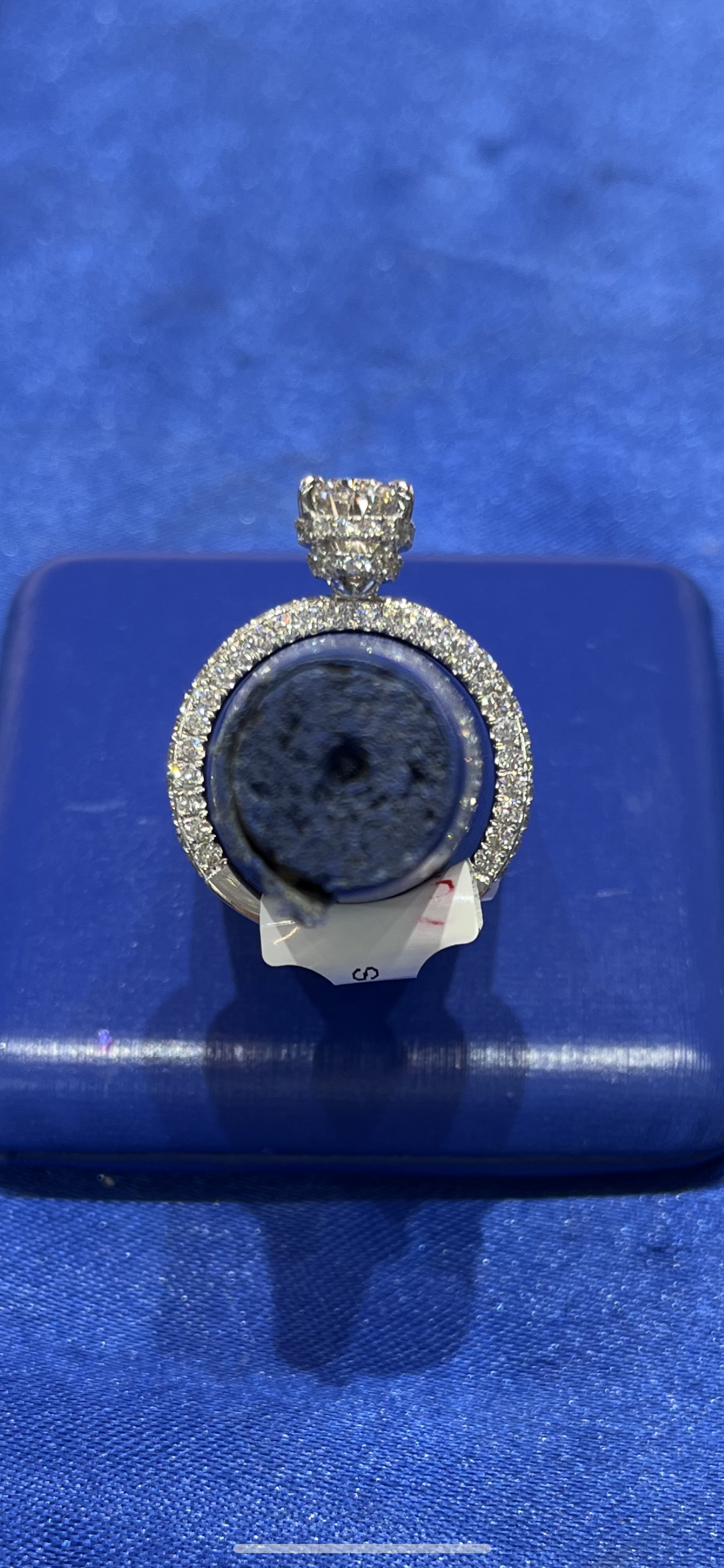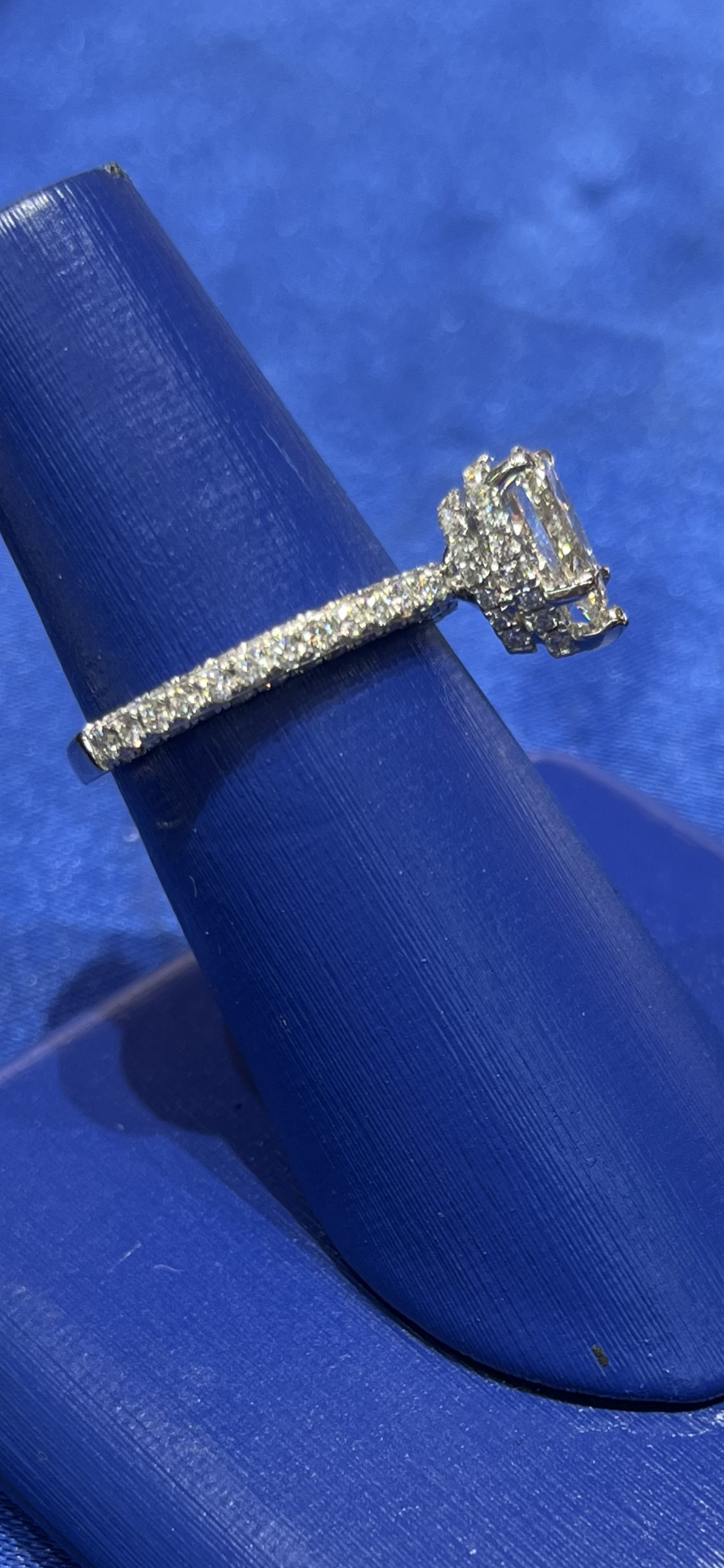 A glance: Beautiful Pear Shaped Center Diamond, set with a 5 prong head, surrounded by 2 Diamond hidden halos, and round Diamonds, set along the top and sides of an 18K White Gold band. Certified