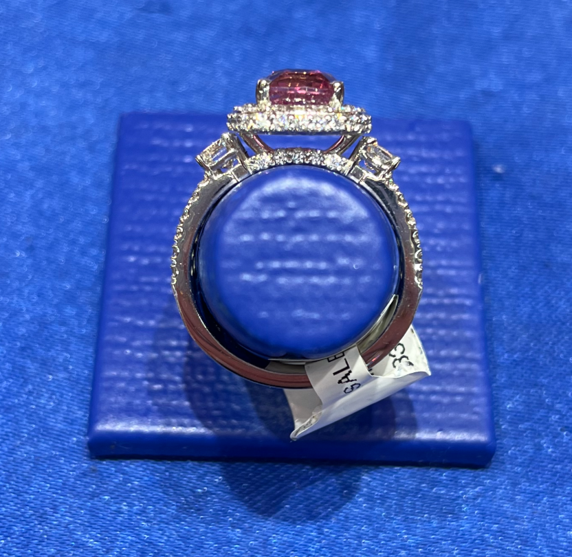 A glance: Elongated Cushion cut pink Sapphire center, set with four prongs. A top facing and perimeter facing Diamond halo surround the center stone . The Sapphire is flanked on either side by an Emerald cut Diamond, and 3 rows of small round Diamonds run halfway down each side of the semi mount. The entirety of the ring is set in 14Karat white Gold.