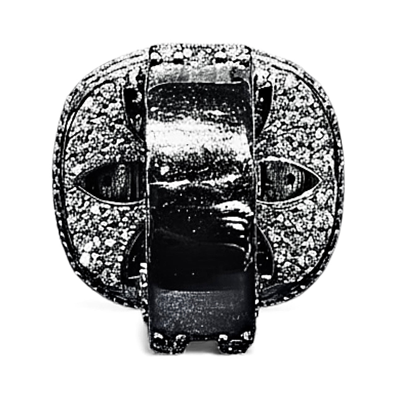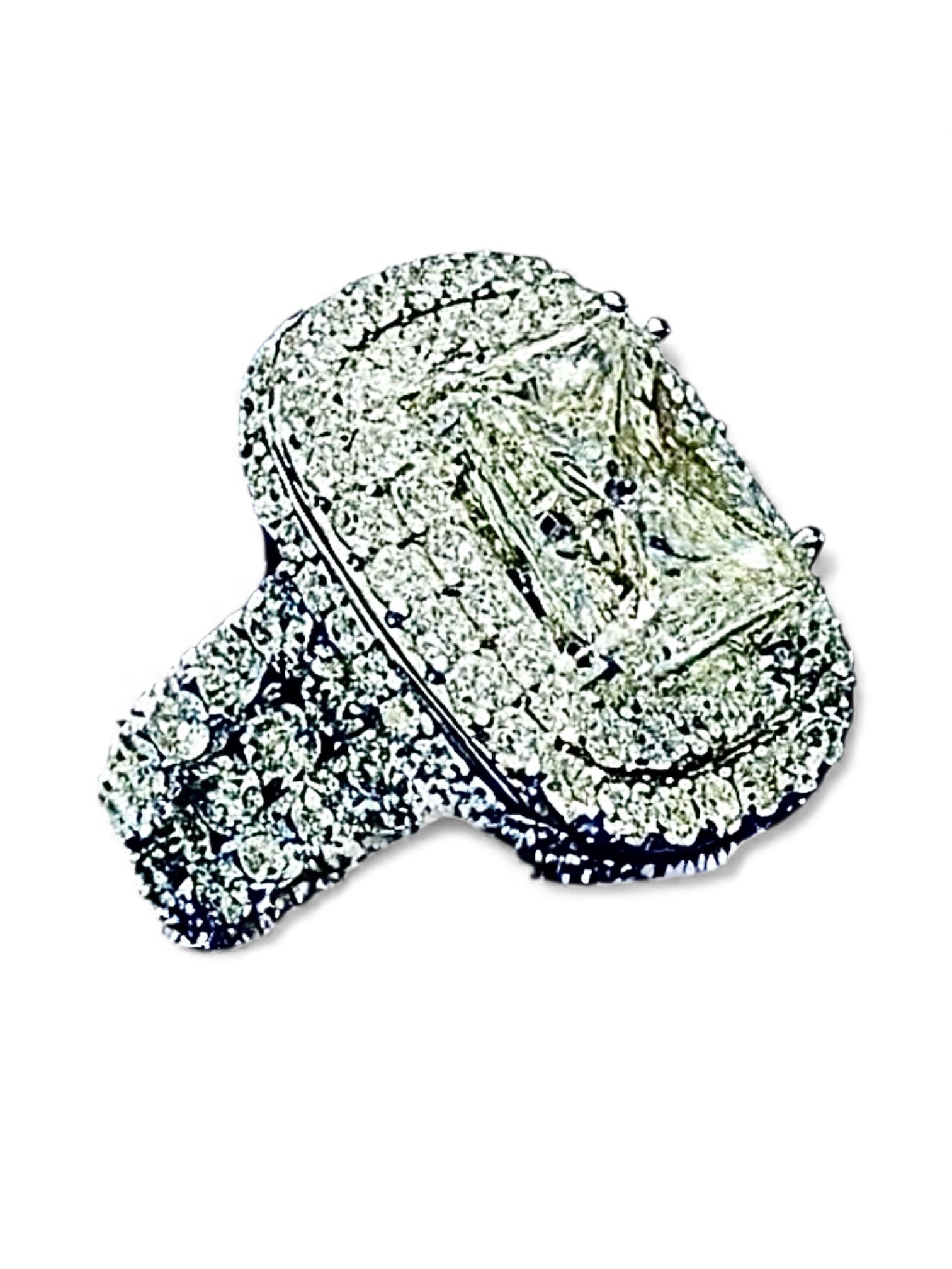 At a glance:  Princess cut Diamond center, surrounded by two top facing, rounded corner, rectangular shaped diamond halos. A third Diamond d halo wraps around the perimeter of the top facing halos. The under gallery has 3 petal shaped cut outs, which are surrounded by small, round Diamonds covering the entirety of the under gallery. Three rows of Round Diamonds run three quarters the length of each side of the semi mount. The entirety of the ring is set in 14K White Gold