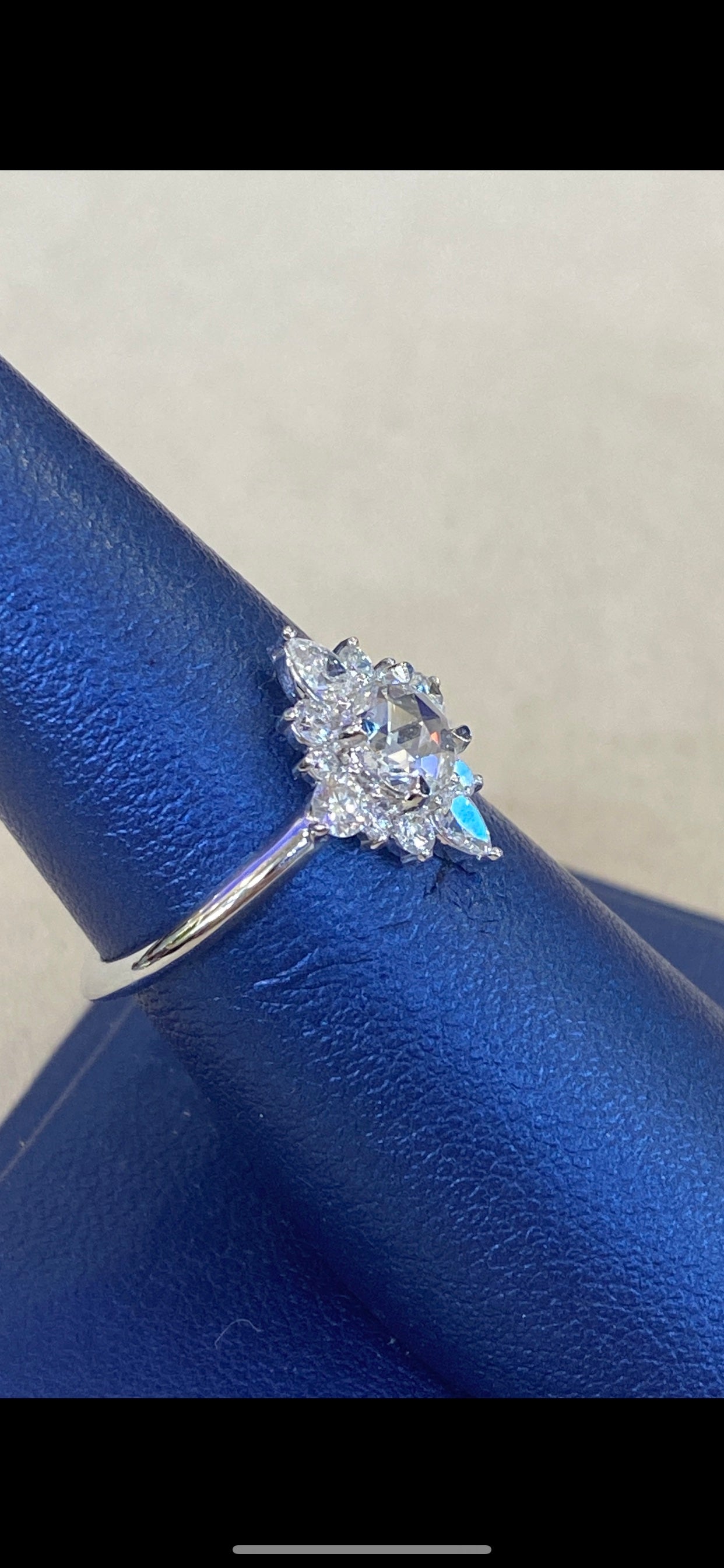 A glance: Rose cut center stone, framed by a starburst shaped halo of round and pear Diamonds, in a band of 18K White Gold