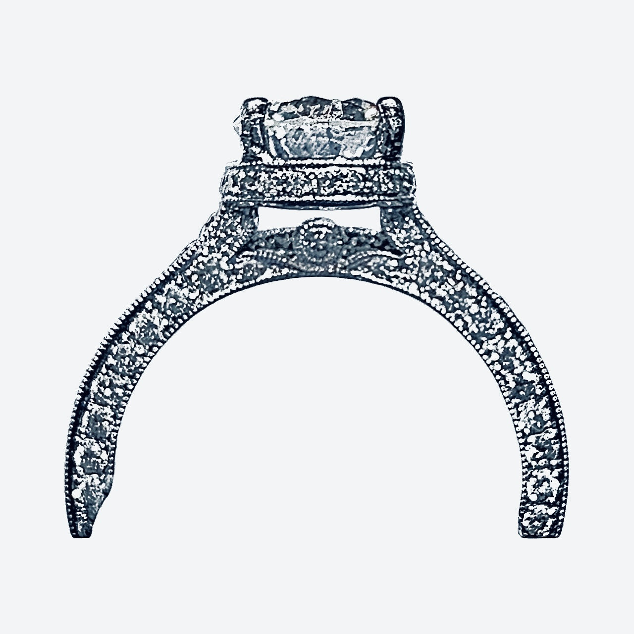 A glance: Round Diamond center, set with four prongs. A hidden halo of round Diamonds and mil grain edging is set below the center stone. Flanking each side of the center stone, round Diamonds are prong set along all three sides of the band. Mil grain edging completes the design of the main ring. A matching wedding band accompanies the main ring. The entirety of the set is done in 18K white Gold.