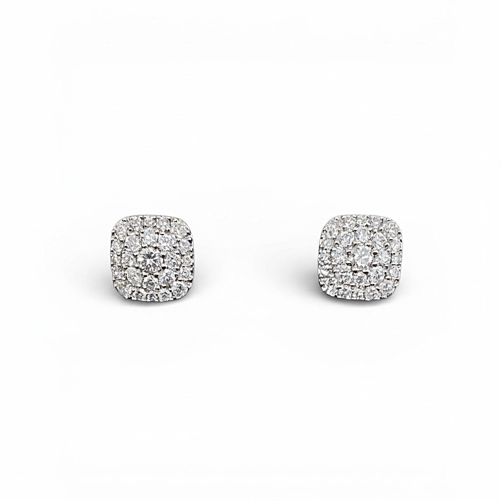 A glance: small round center Diamond, surrounded by two halos of Diamonds in a square design, in White Gold