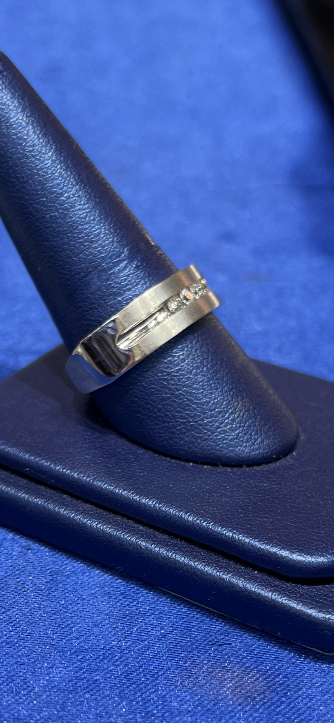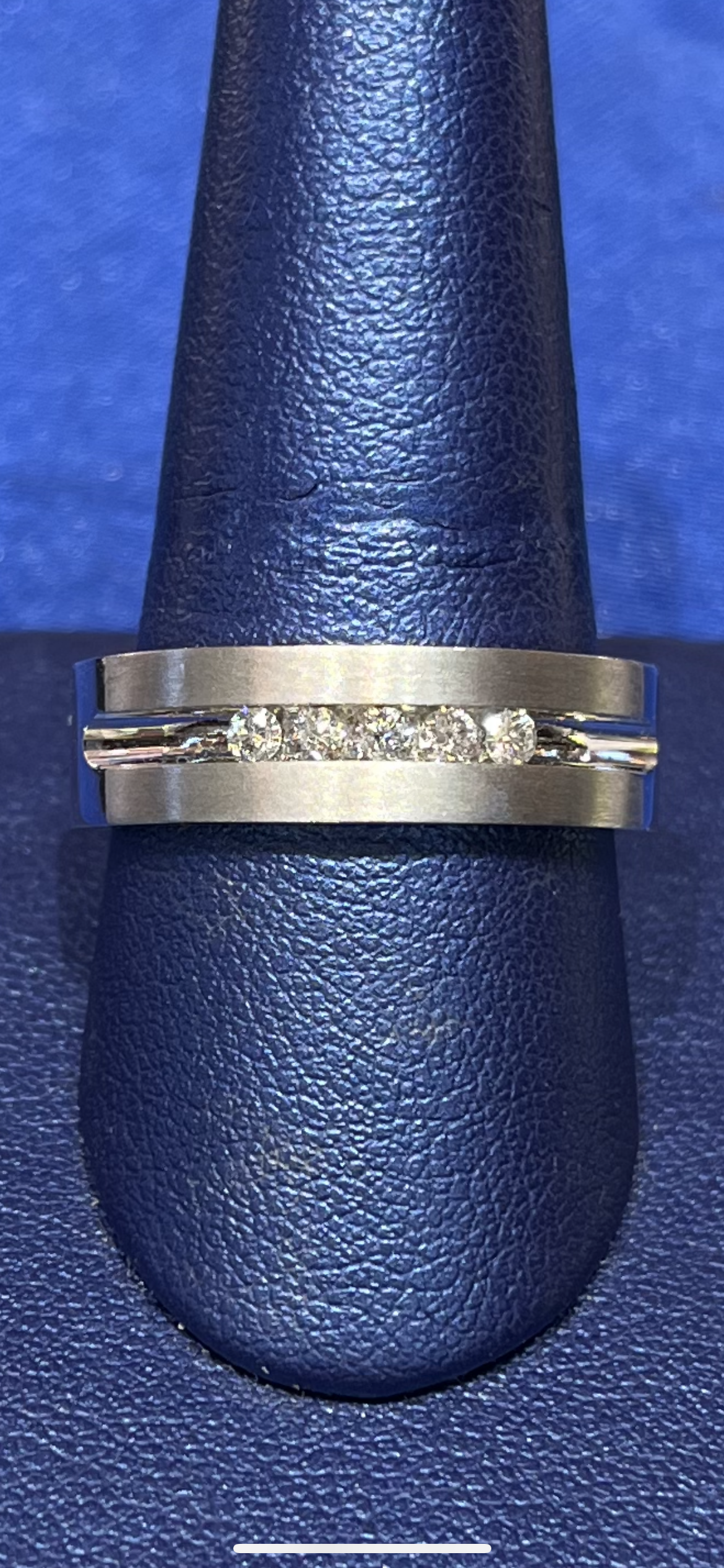 Mens White Gold Band, featuring 5 Round Diamonds, channel set in a high-polish center channel, surrounded by by a matte-finish band