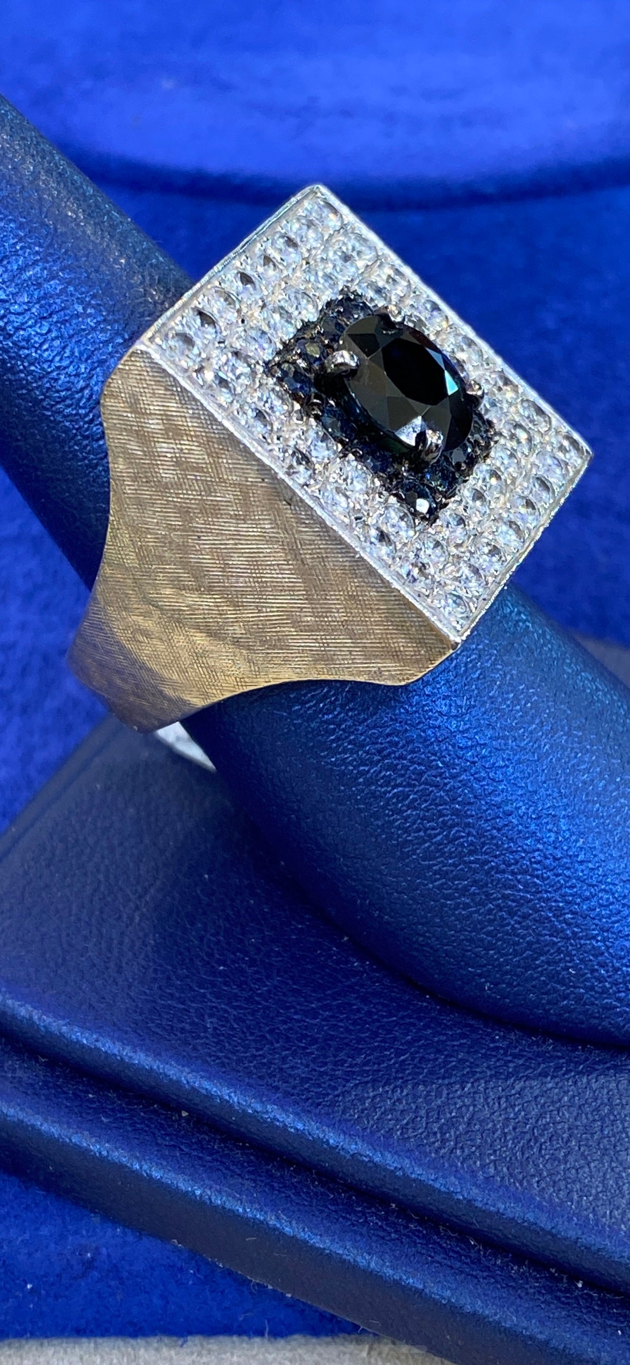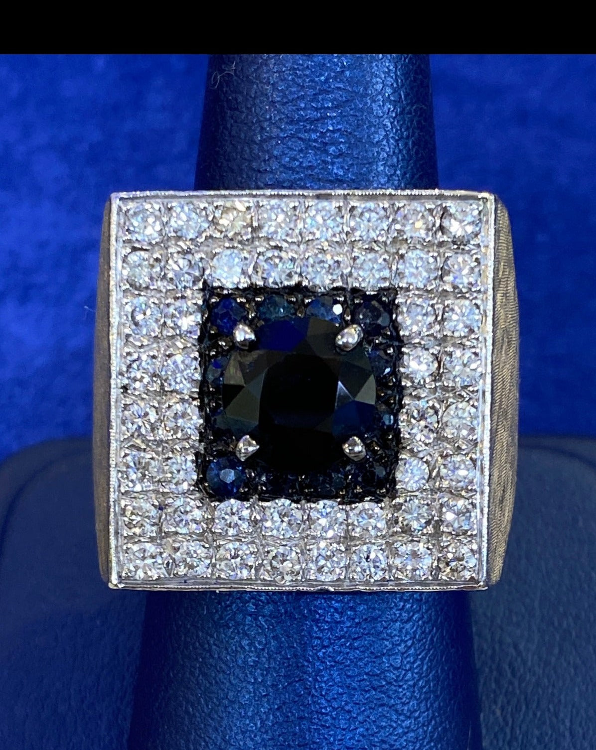 A glance: midnight blue center Sapphire surrounded by a halo of small blue Sapphires, surrounded by 2 rows of white Diamonds, set in a band of Yellow Gold(brushed gold, not polished)