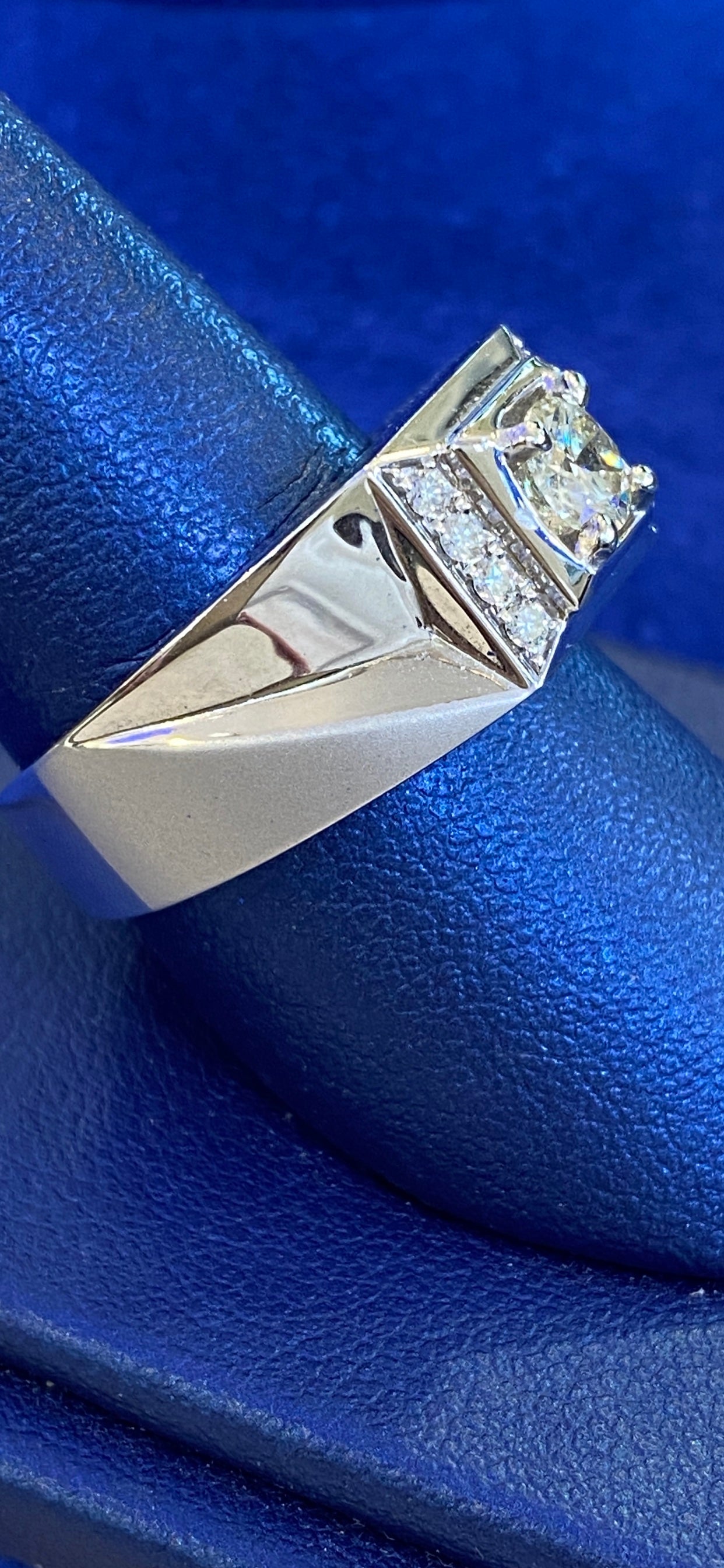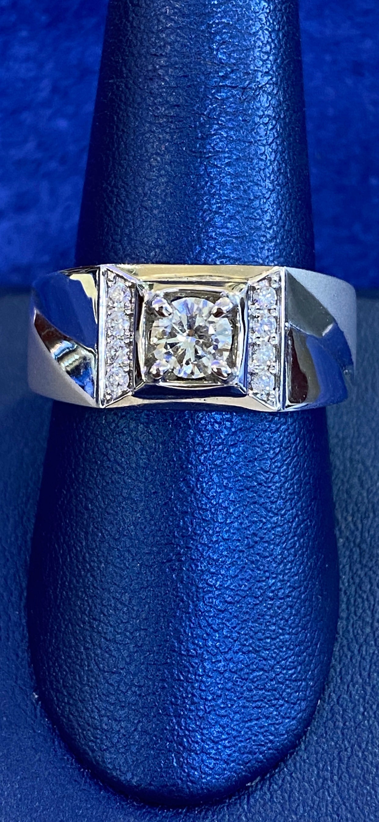 Mens Classic White Gold Band with Diamond center stone, flanked by 1 vertical row each of pave set Diamonds, set in White Gold band(1/2 polished, 1/2 brushed)