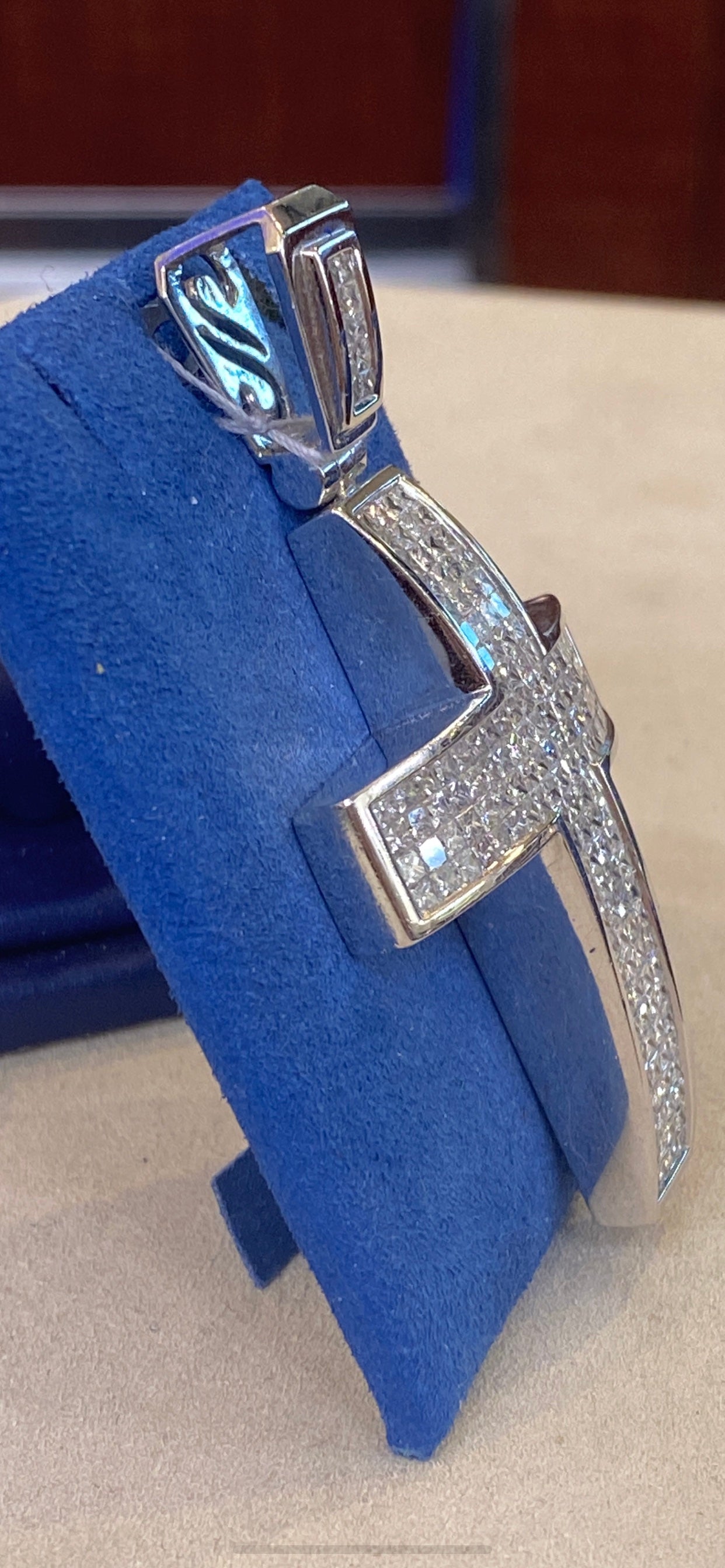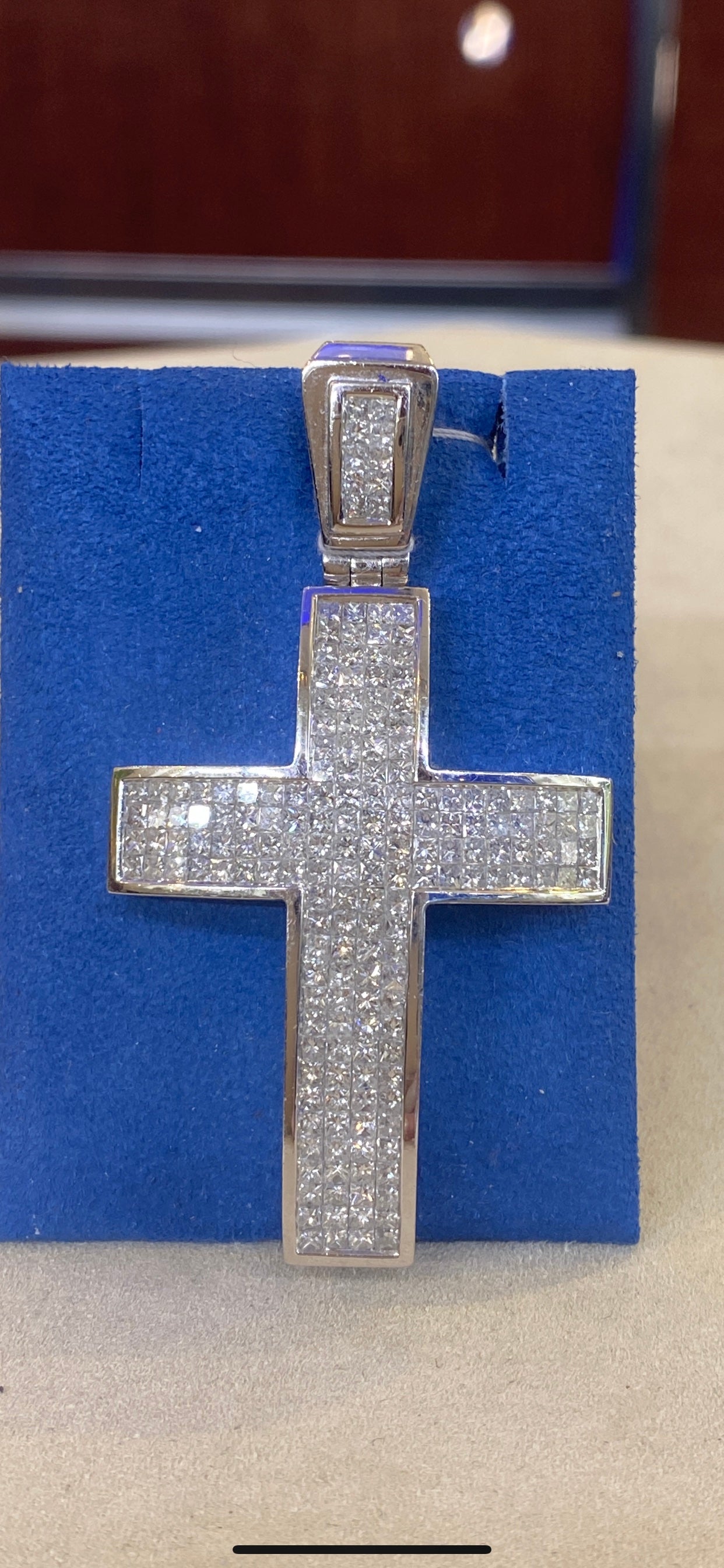 A glance: 4 rows of princess-cut Diamonds, set in a White Gold cross, with a large Diamond bail (designed for larger chains)