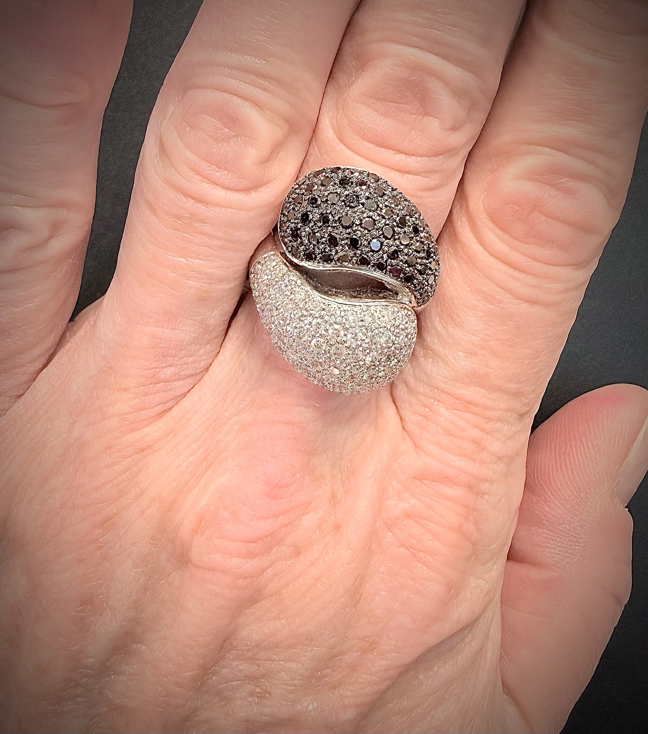 A glance: round black and white Diamonds, set in a wide yin yang design. The entirety of the ring is set in a band of 18K white Gold