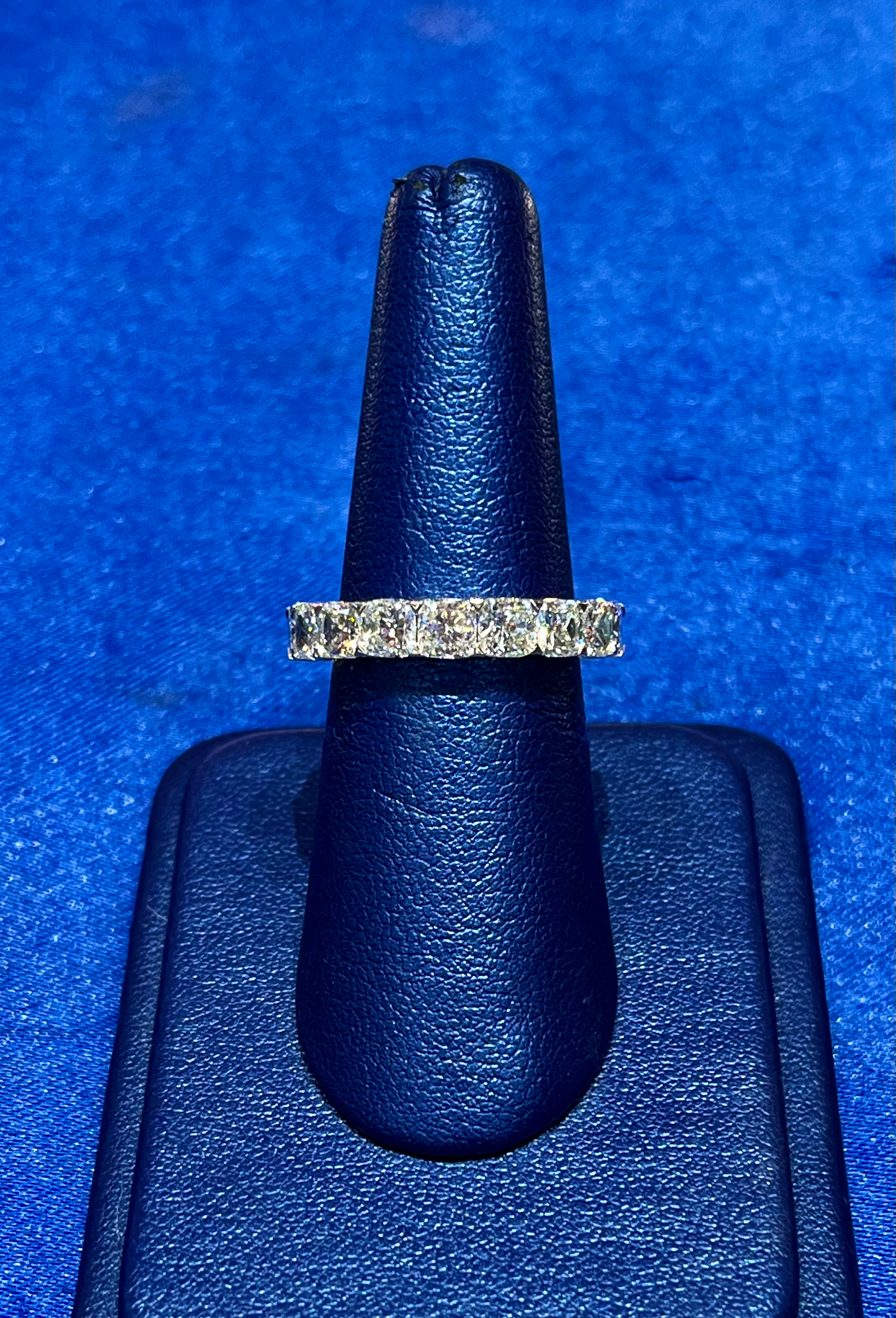 A glance: 18 cushion cut Diamonds, set with 4 prongs each. The entirety of the ring is set in White Gold