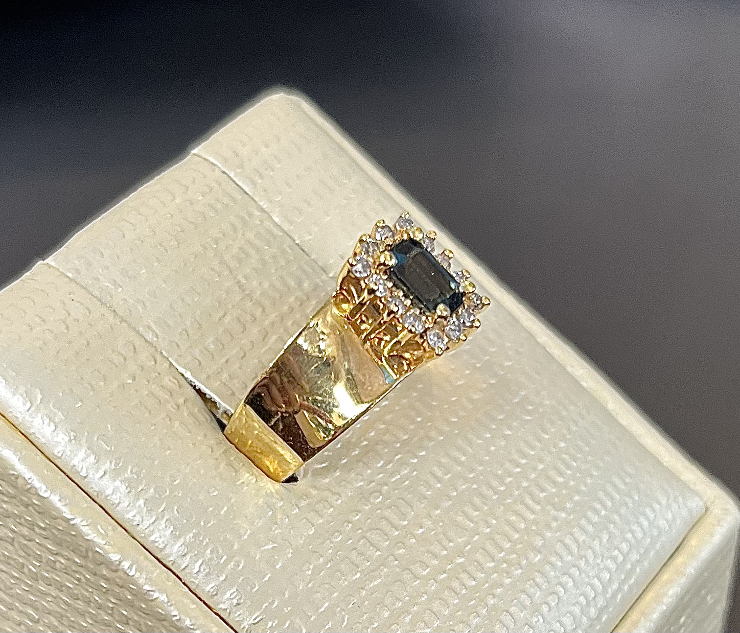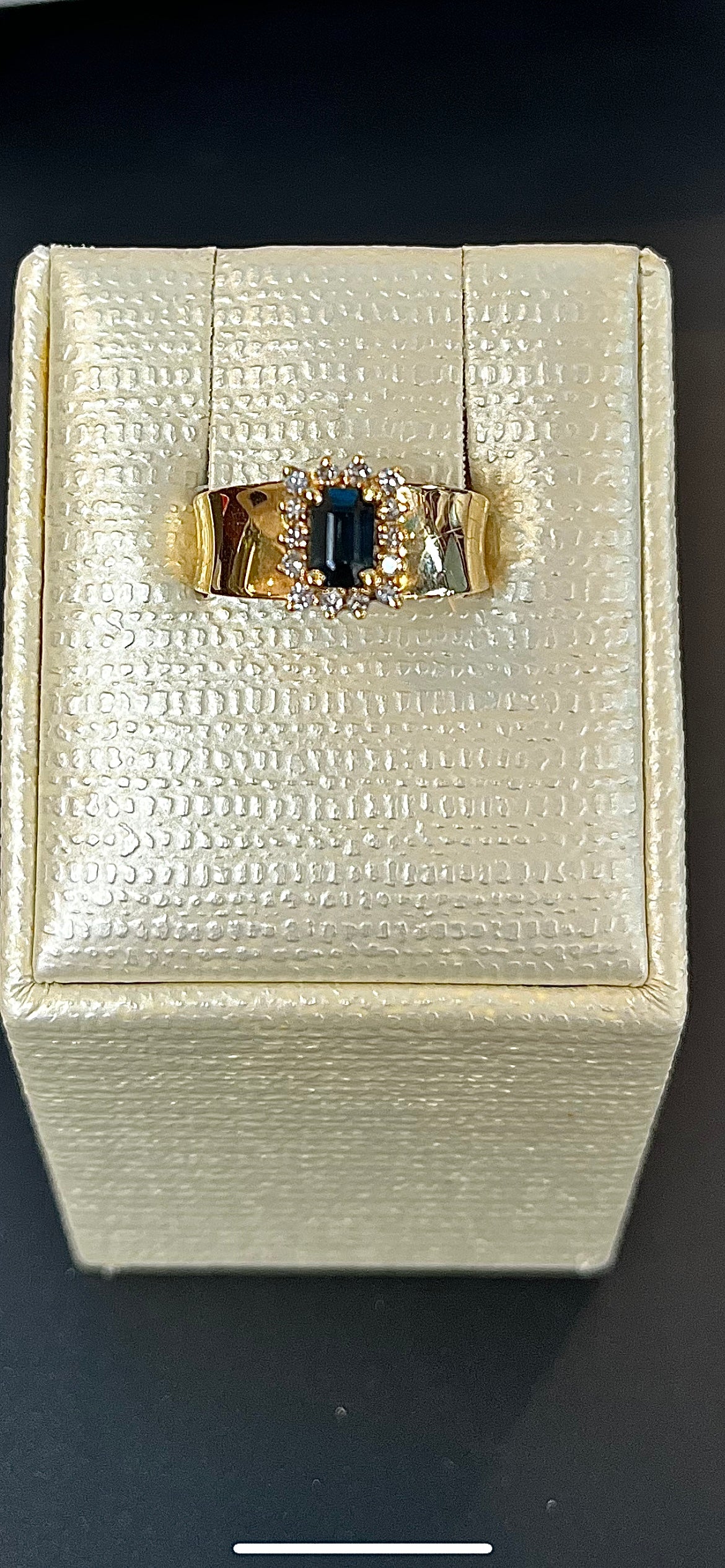 A glance: dark blue oval Sapphire center, set with four prongs. The center stone is surrounded by a Diamond halo. The entirety of the ring is set on a 14K yellow Gold band of approximately 8mm at the center, and tapering down in width