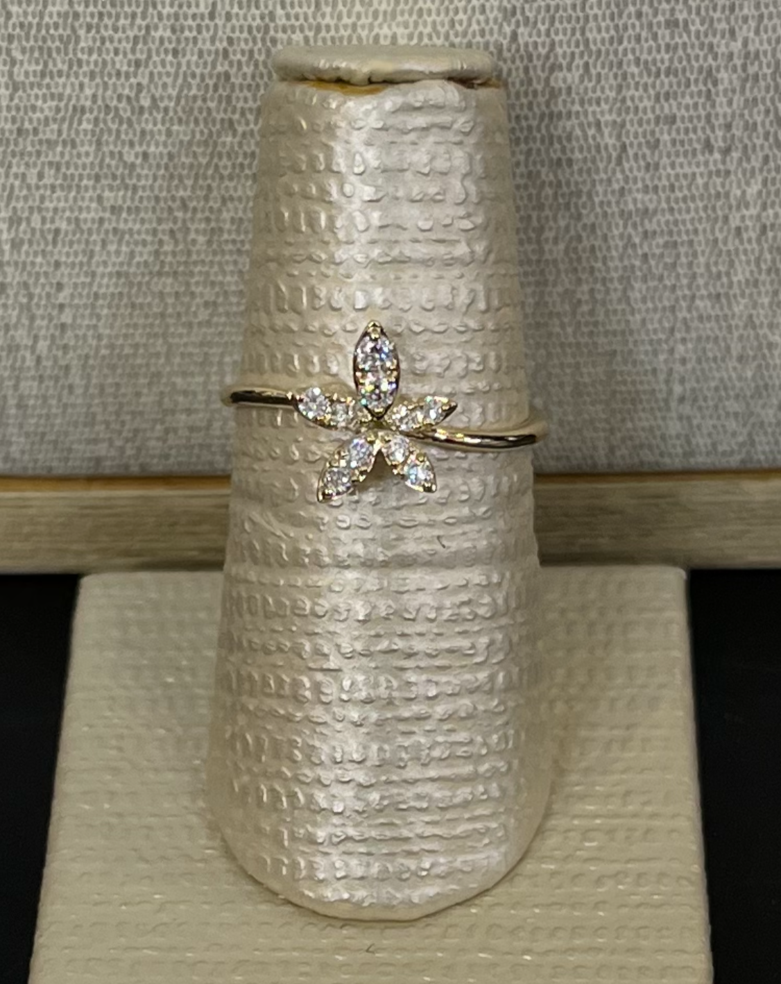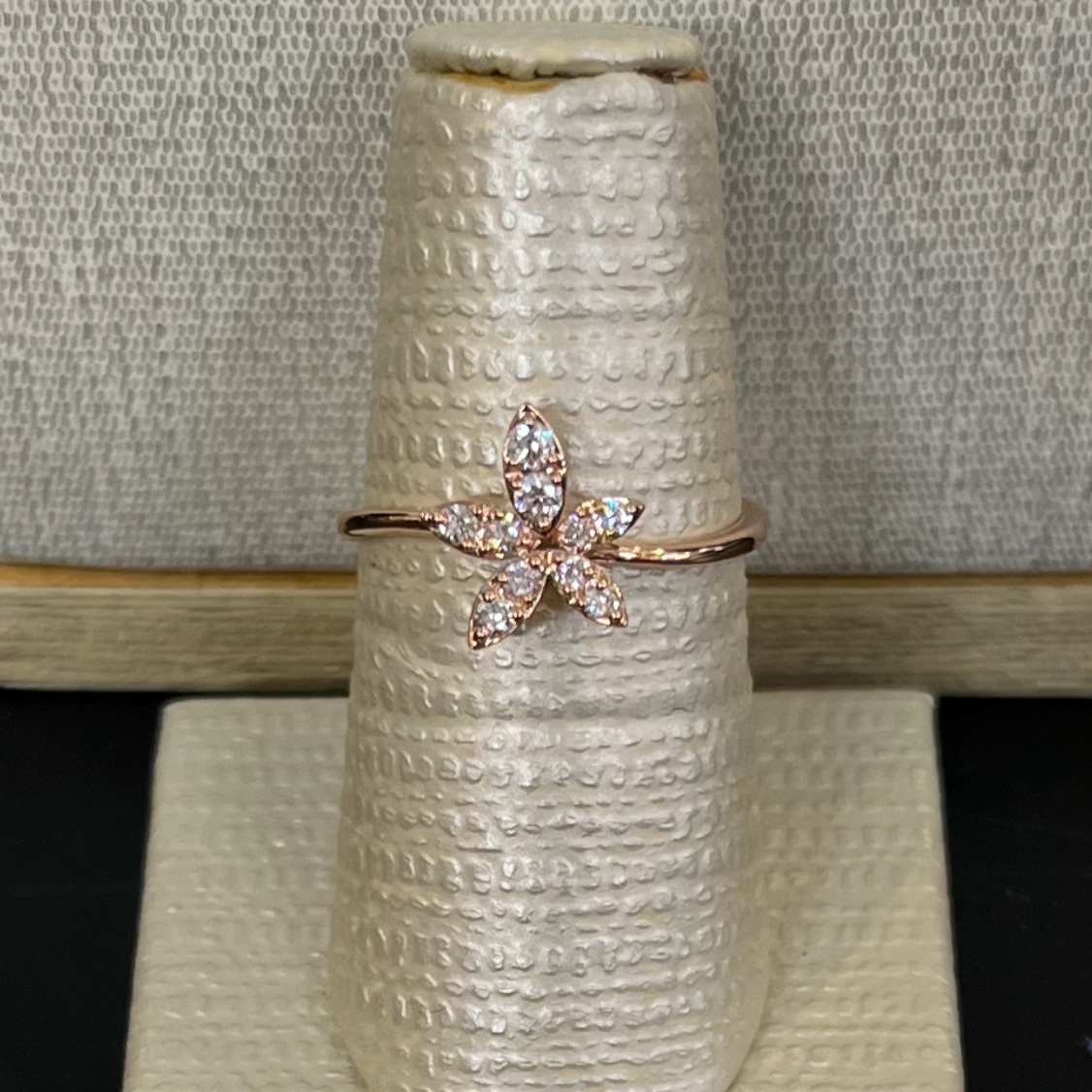 A glance: 2 small round Diamonds, sharing 3 prongs with each other, are set in a thin marquise shaped bezel, imitating a flower petal. Five petals are centered on a thin Gold band, with a slight wave bend in the front. The entirety of the ring is set in either yellow or rose Gold