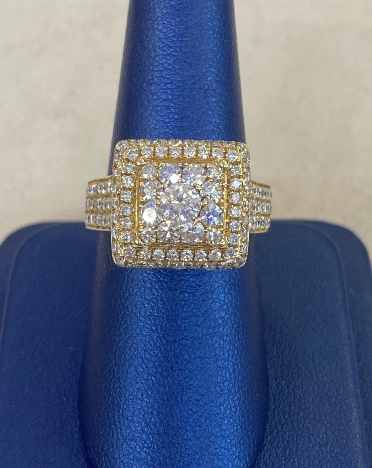 A glance: Center stone, surrounded by an inner halo of white diamonds, framed by a thin gold frame, then surrounded by two halos of white diamonds, with 3 flanking bands of diamonds on either side in a band of Yellow Gold
