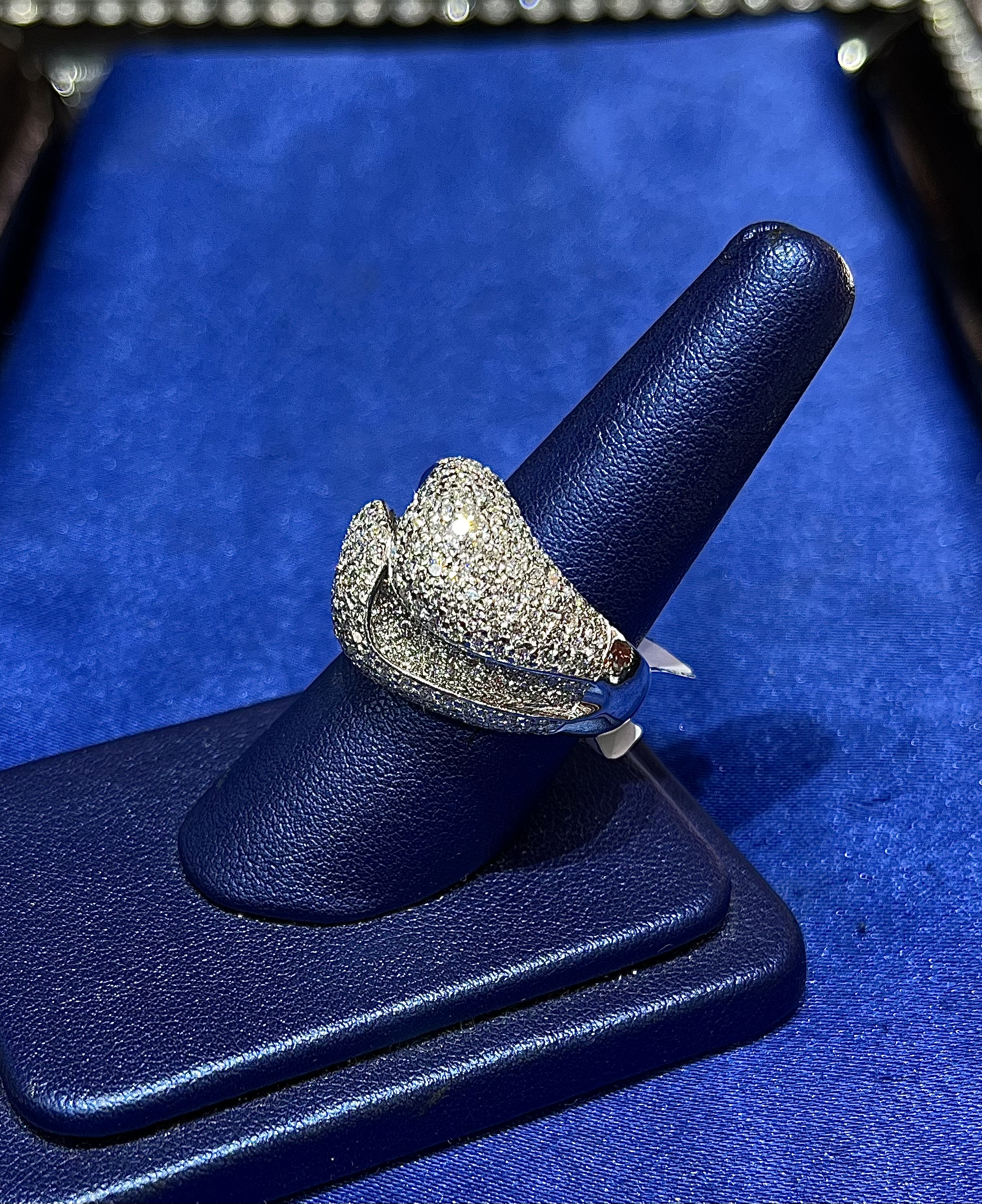 A glance: small pave Diamonds, set in a swirled geometric design of wide width. The entirety of the ring is set in white Gold.