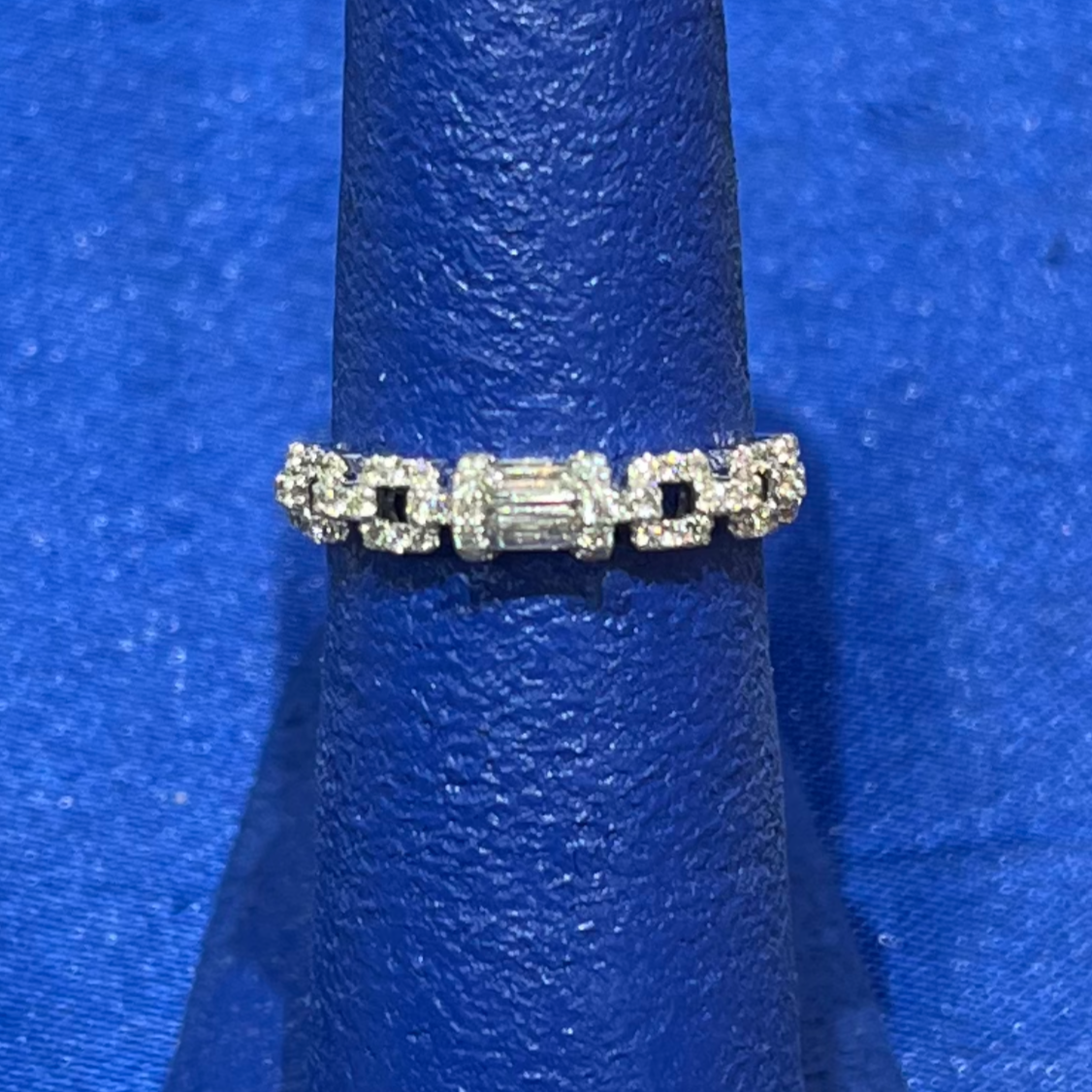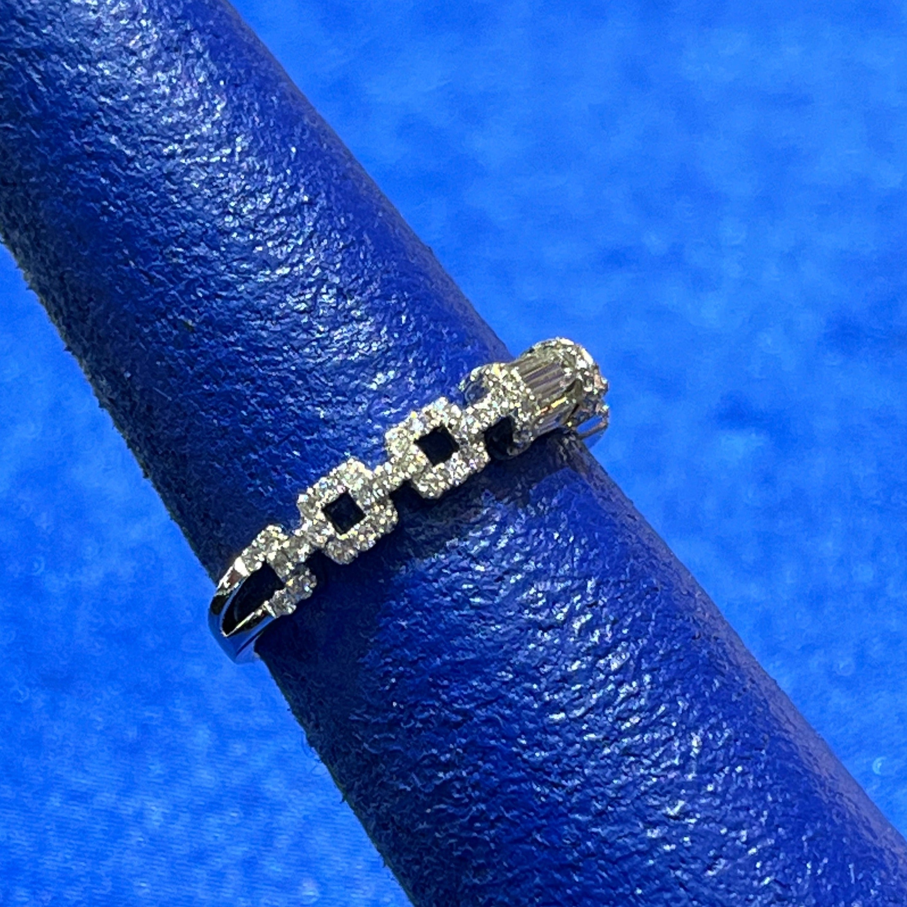 A glance: Pave Diamonds, set in an open link chain design, with center baguette diamonds, all in a band White Gold. Also available in Yellow Gold