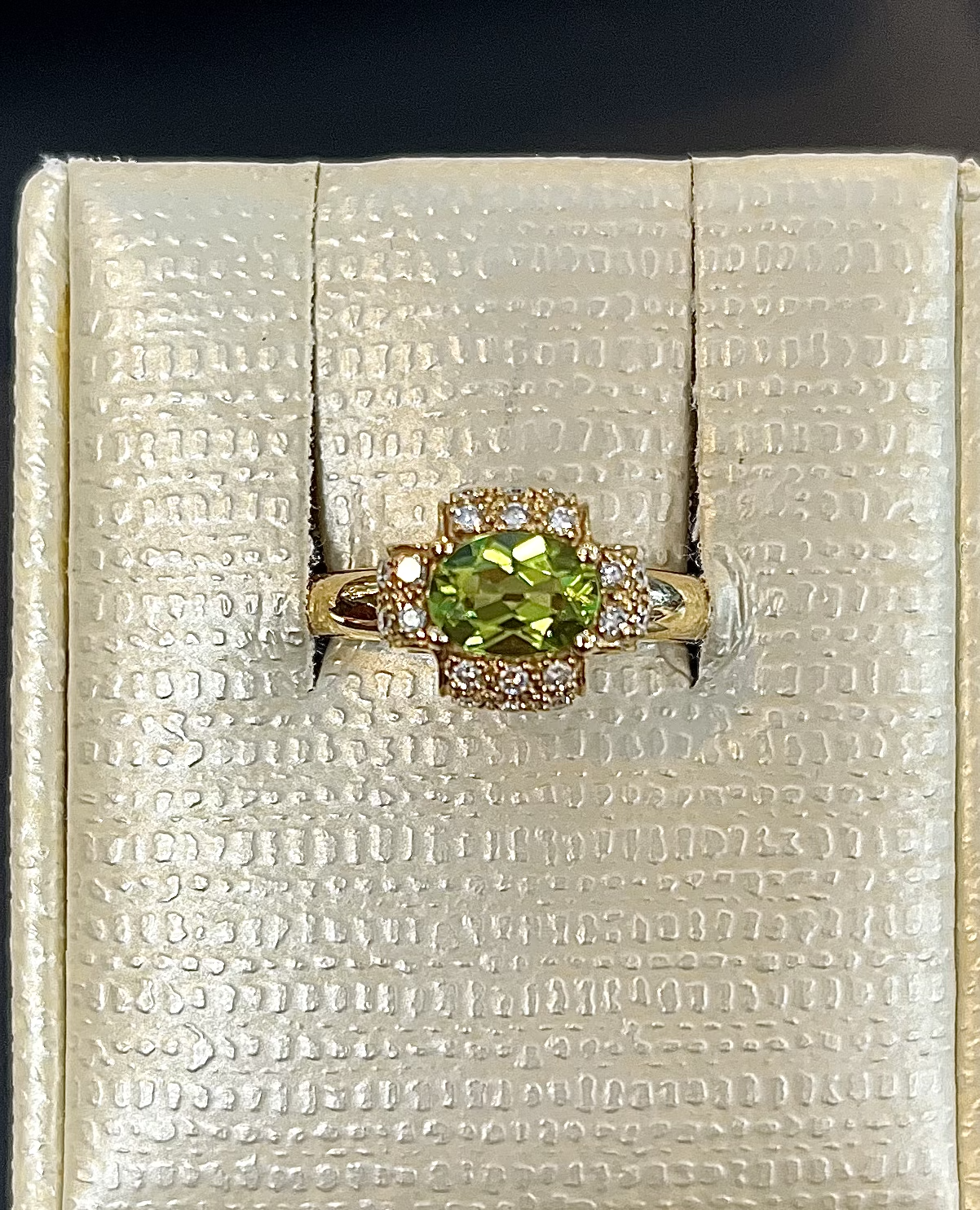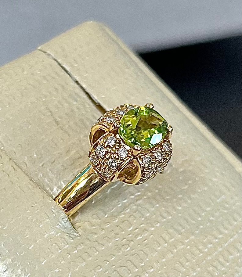 A glance: Oval Peridot center, set in an east west style, with four prongs. On the top and bottom of the center stone are three curved rows of round Diamonds, and two rows on the left and right, creating the illusion of a Diamond halo. with Diamond halo. The entirety of the ring is set in 14Karat yellow Gold