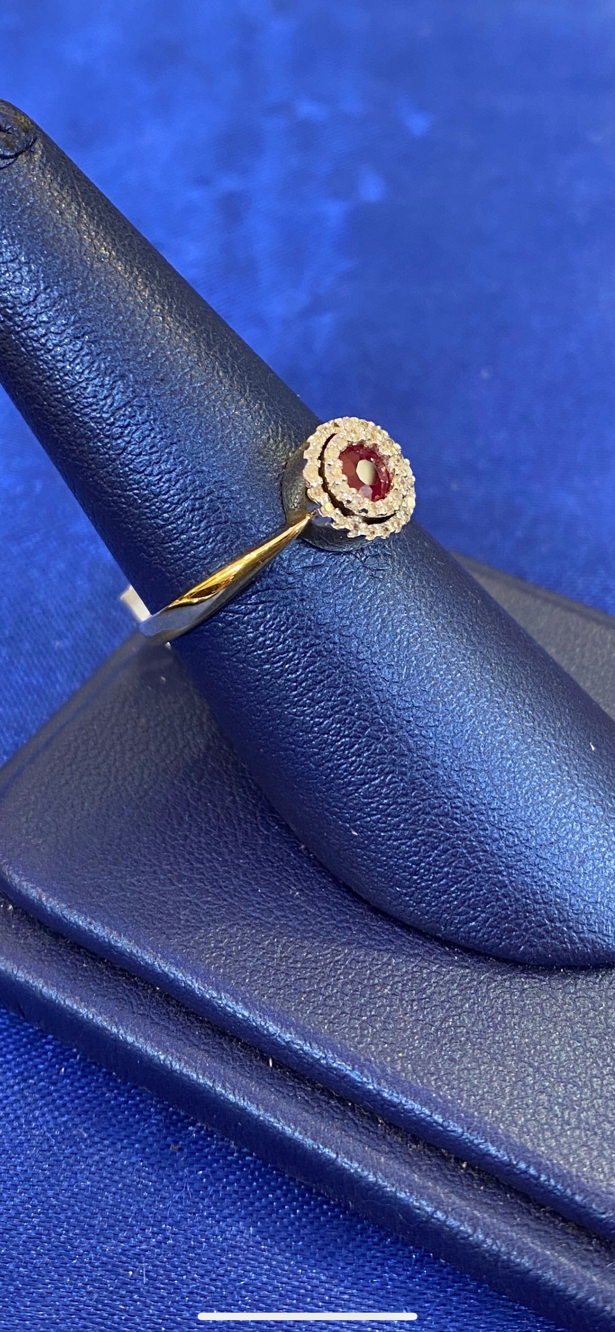 A glance: Round Ruby, surrounded by a double halo of round white Diamonds, on a band of Yellow Gold