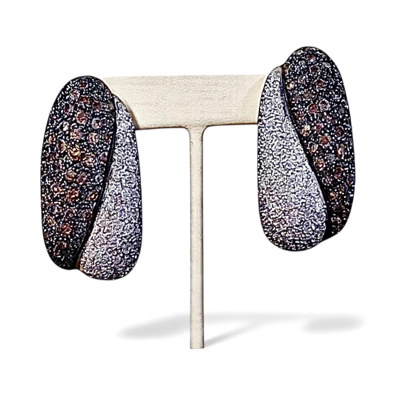 A glance: white and chocolate Diamonds, prong-set in a yin yang design with lever-back posts, in White Gold
