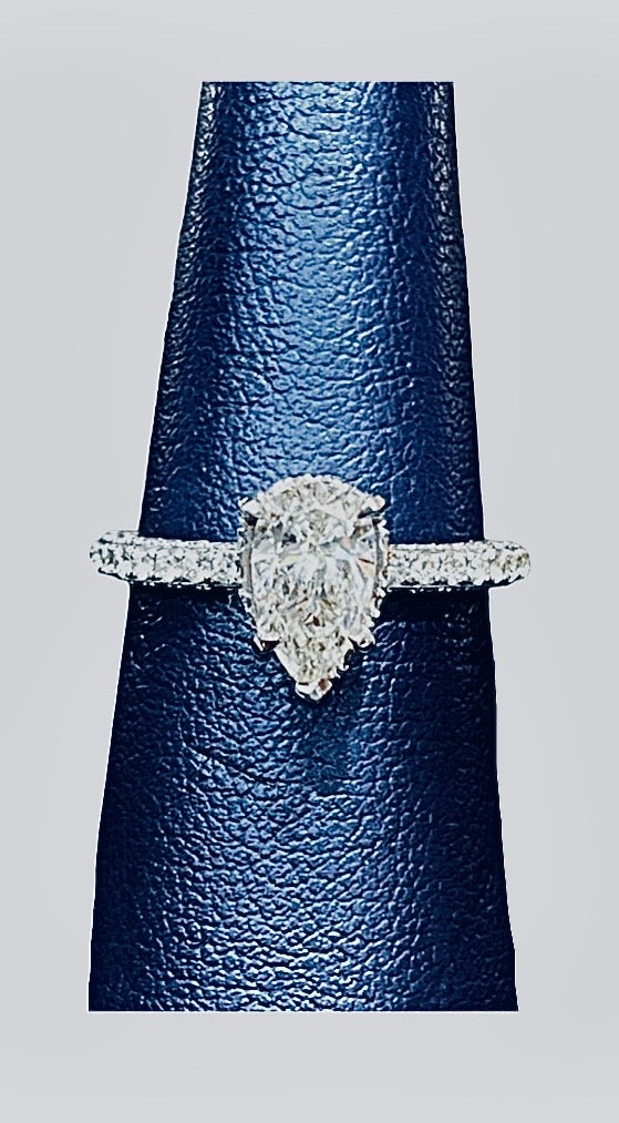 A glance: Beautiful Pear Shaped Center Diamond, set with a 5 prong head, surrounded by 2 Diamond hidden halos, and round Diamonds, set along the top and sides of an 18K White Gold band. Certified