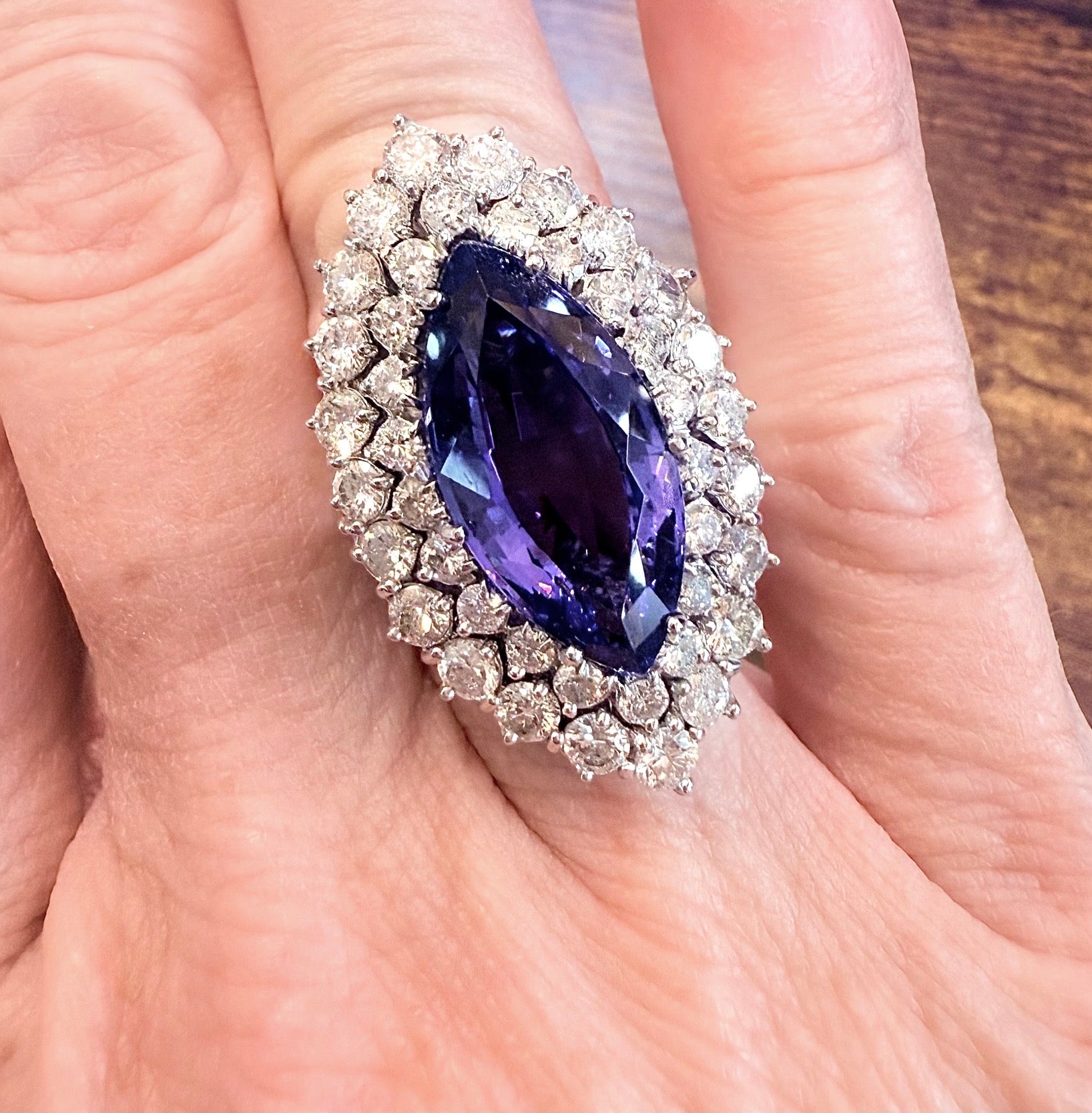 A glance: Marquise-shaped Tanzanite, set in a 6 prong head, surrounded by a double row Diamond halo. All set in 14Karat White Gold